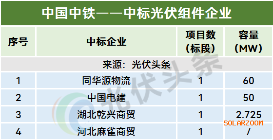 我国中铁在本计算周期,有4个项目(标段)定标,容量112.73MW。湖北乾兴商贸、河北麻雀商贸等中标。