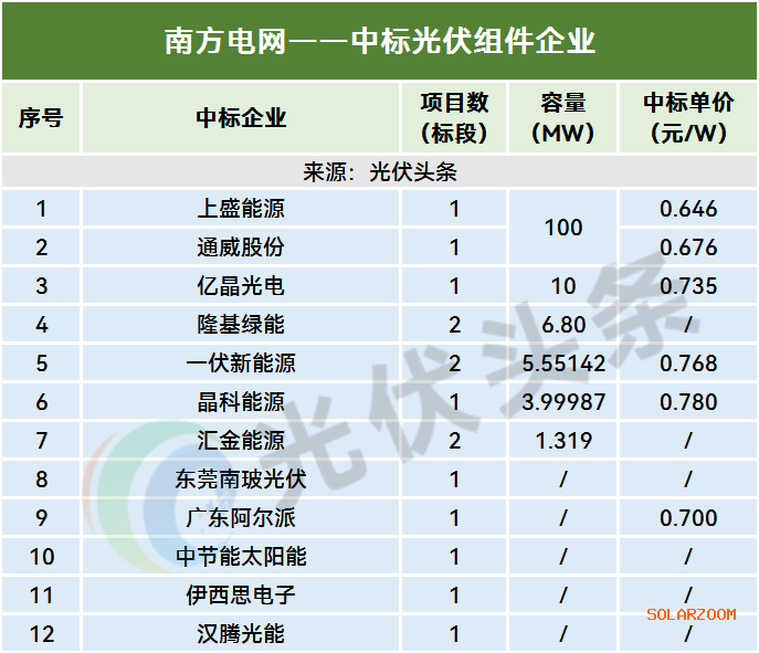 6、中标企业方面,晋能科技、协鑫集成、隆基绿能、晶科动力、环晟光伏、华耀光电、东方日升、英利开展、高景太阳能、国晟科技、美科股份等195家企业中标。
